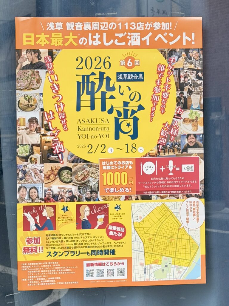 2026年2月中旬までの期間中、113もの名店・老舗の味が1,000円で気軽に楽しめるまたとないチャンスです。雷門や仲見世の賑わいとは一味違う、落ち着いた「大人の浅草」をぜひ体験してみてください。